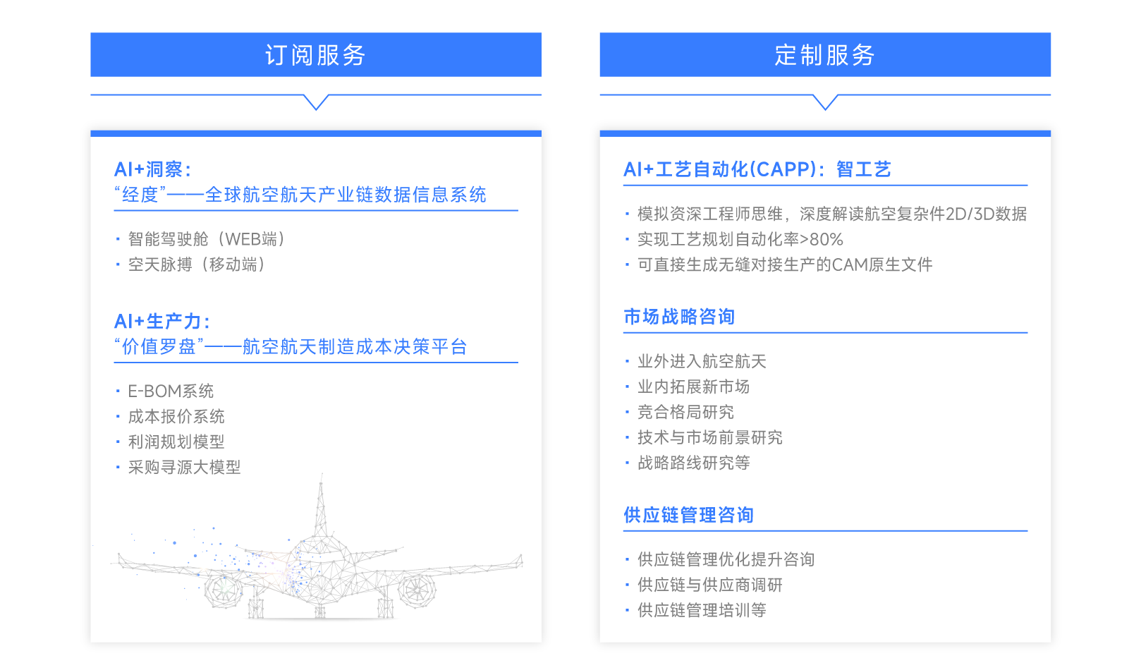 作為國家級高新技術企業,捷一科技致力于為航空航天領域提供市場與供應鏈端的數據決策解決方案,以及生產制造端的智能化升級解決方案。公司憑借自身強大的航空航天產業鏈數據庫基礎,深度融合前沿人工智能(AI)技術,構建了涵蓋“AI+洞察、AI+生產力、企業戰略咨詢"的三維業務矩陣與智能產品組合,幫助客戶快速洞察市場趨勢、優化生產制造效率、精準匹配供需、監測供應鏈風險等,助力企業全面提升運營效率和競爭力。